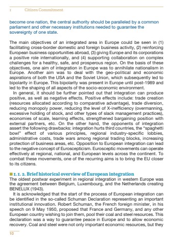 become one nation, the central authority should be paralleled by a commonparliament and other necessary institutions needed to guarantee thesovereignty of one state. The main objectives of an integrated area in Europe could be seen in (1)facilitating cross-border domestic and foreign business activity, (2) reinforcingEuropean business opportunities abroad, (3) giving Europe and its corporationsa positive role internationally, and (4) supporting collaboration on complexchallenges for a healthy, safe, and prosperous region. On the basis of theseobjectives, one aim of integration in Europe was to annihilate nationalism inEurope. Another aim was to deal with the geo-political and economicaspirations of both the USA and the Soviet Union, which subsequently led tobipolarity in Europe. This bipolarity was present in Europe until post-1989 andled to the shaping of all aspects of the socio-economic environment. In general, it should be further pointed out that integration can producepositive, as well as negative effects. Positive effects include: trade creation(resources allocated according to comparative advantage), trade diversion,reducing monopoly power, reducing the level of X-inefficiency (overmanning,excessive holding of stock, and other types of slack management practices),economies of scale, learning effects, strengthened bargaining position withexternal partners, etc. On the other hand, the opponents of integrationassert the following drawbacks: integration hurts third countries, the %u201cspaghettibowl%u201d effect of various principles, regional industry-specific lobbies,administrative costs, trade wars among regional trading blocks, increasingprotection of business areas, etc. Opposition to European integration can leadto the negative concept of Euroscepticism. Eurosceptic movements can operateeffectively at regional, national, and European levels across the continent. Tocombat these movements, one of the recurring aims is to bring the EU closerto its citizens.n 1. 1. 2. Brief historical overview of European integrationThe oldest postwar experiment in regional integration in western Europe wasthe agreement between Belgium, Luxembourg, and the Netherlands creatingBENELUX (1943). It is acknowledged that the start of the process of European integration canbe identified in the so-called Schuman Declaration representing an importantinstitutional innovation. Robert Schuman, the French foreign minister, in hisspeech on 9 May 1950, proposed that France and Germany, and any otherEuropean country wishing to join them, pool their coal and steel resources. Thisdeclaration was a way to guarantee peace in Europe and to allow economicrecovery. Coal and steel were not only important economic resources, but they101 Citizen Commitment