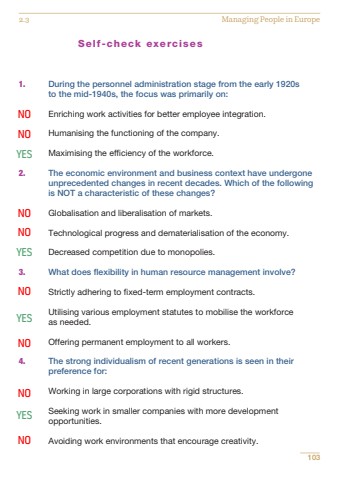 Self-check exercises1. During the personnel administration stage from the early 1920s to the mid-1940s, the focus was primarily on:Enriching work activities for better employee integration.Humanising the functioning of the company.Maximising the efficiency of the workforce.2. The economic environment and business context have undergone unprecedented changes in recent decades. Which of the following is NOT a characteristic of these changes?Globalisation and liberalisation of markets.Technological progress and dematerialisation of the economy.Decreased competition due to monopolies. 3. What does flexibility in human resource management involve?Strictly adhering to fixed-term employment contracts.Utilising various employment statutes to mobilise the workforce as needed. Offering permanent employment to all workers.4. The strong individualism of recent generations is seen in their preference for:Working in large corporations with rigid structures.Seeking work in smaller companies with more development opportunities. Avoiding work environments that encourage creativity.1032.3 Managing People in EuropeNONOYESNO NO YESNO YES NO NO YESNO