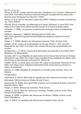 ReferencesAlioua, M. (2018). La place des femmes dans l%u2019entreprise: tour d%u2019horizon. Retrieved 15June 2023, from https://solutions.lesechos.fr/equipe-management/c/la-place-desfemmes-dans-lentreprise-tour-dhorizon-13532/.Arnaud, N. et al. (2013). Nouveaux enjeux de la GRH. Pratiques actuelles et %u00e9tudes decas. Paris: Ellipses.CEGOS. (2012). Enqu%u00eate: Les Millennials et le travail. Retrieved 15 June 2023, fromhttps://www.cegos.fr/actualites/news/les-jeunes-et-le-travail-enquete-cegos.Chonchol, J. (1996). Les grandes mutations %u00e9conomiques et leurs cons%u00e9quencessociales.Reflexi%u00f3n y liberaci%u00f3n, 1996(29). Retrieved 20 July 2023, fromhttp://www.globenet.org/archives/web/2006/www.globenet.org/horizon-local/dial/2124.Citeau, J. P. (2000). Gestion des ressources humaines. Paris: Armand Colin.DARES. (2016). Le taux de syndicalisation en Europe. Etude n%u00b0. 025, mai 2016.Retrieved 20 July 2023, from https://cftc-cadres.fr/le-taux-de-syndicalisation-eneurope/.De Raymond, J. F. (2015). L%u00b4esprit de la diplomatie. Du particulier %u00e0 l%u00b4universel. Paris:Manitoba. Les Belles lettres.Eurostat. (2017). Les in%u00e9galit%u00e9s de salaire entre les femmes et les hommes en Europe.Retrieved 20 July 2023, from https://www.inegalites.fr/Les-inegalites-de-salaire-entreles-femmes-et-les-hommes-en-Europe?id_ theme=23.FOxRH. (2016). Le climat dans la function RH: enjeux et paradoxes. Retrieved 20 July2023, from https://www.slideshare.net/AzizBoustil/le-climat-dans-la-fonction-rhenjeux-et-paradoxes.G%u00e9linier, O. (1999). Strat%u00e9gie de l%u00b4entreprise et motivation des hommes. Paris: LesEditionsd%u00b4Organisation.Galambaud, B. (2014). R%u00e9inventer le management des ressources humaines. RuelMalmaison: Editions Liaisons. Wolters Kluwer France.Greenwood, M. (2002). Ethic and HRM: a Review and Conceptual Analysis. Journal ofBusiness Ethics, 36(3).Haegel, A. (2016). Ressources humaines. Paris: Dunod.Lelarge, G. (2014). G%u00e9rer les ressources humaines. Finalit%u00e9s, actions, outils. Paris:Arnaud Franel Editions.Lelarge, G. (2006). La gestion des ressources humaines. Finalit%u00e9s, actions, outils.Paris: S%u00e9fi %u00e9ditions.Liger, P. (2004). Le marketing des Ressources Humaines. Paris: Dunod.1052.3 Managing People in Europe