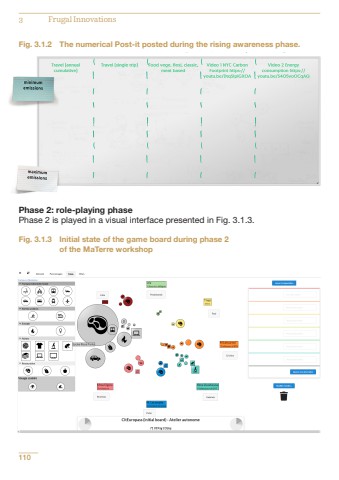1103 Frugal InnovationsFig. 3.1.2 The numerical Post-it posted during the rising awareness phase. Note: Last two columns report the feedback given by participants in link with the two videos described in Fig. 3.1.1.Phase 2: role-playing phasePhase 2 is played in a visual interface presented in Fig. 3.1.3.Fig. 3.1.3 Initial state of the game board during phase 2 of the MaTerre workshop