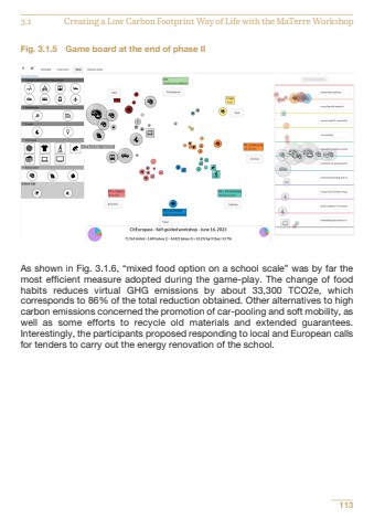 1133.1 Creating a Low Carbon Footprint Way of Life with the MaTerre WorkshopFig. 3.1.5 Game board at the end of phase IIAs shown in Fig. 3.1.6, %u201cmixed food option on a school scale%u201d was by far themost efficient measure adopted during the game-play. The change of foodhabits reduces virtual GHG emissions by about 33,300 TCO2e, whichcorresponds to 86% of the total reduction obtained. Other alternatives to highcarbon emissions concerned the promotion of car-pooling and soft mobility, aswell as some efforts to recycle old materials and extended guarantees.Interestingly, the participants proposed responding to local and European callsfor tenders to carry out the energy renovation of the school.