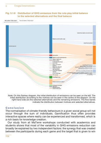 1143 Frugal InnovationsFig. 3.1.6 Distribution of GHG emissions from the role-play initial balance to the selected alternatives and the final balanceNote: On this Sankey diagram, the initial distribution of emissions can be seen on the left. Theinitial distribution according to the motives can be seen in the centre of the diagram. On theright-hand side are the selected alternatives and the remaining emissions. The flow bandsindicate the distribution between motives and selected alternatives.ConclusionThe normalisation of climate-friendly behaviours in a given social group will notoccur through the sum of individuals. Gamification thus often providesinteractive spaces where reality can be experienced and transformed, which isa rich basis for knowledge creation.Our study from all MaTerre workshops conducted with academics andstudents shows that most of the variability in GHG emissions reduction canbroadly be explained by two independent factors: the synergy that was createdbetween the participants during each game and the target that is given to win