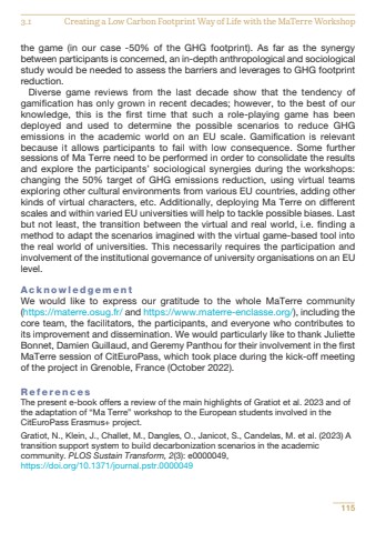 1153.1 Creating a Low Carbon Footprint Way of Life with the MaTerre Workshopthe game (in our case -50% of the GHG footprint). As far as the synergybetween participants is concerned, an in-depth anthropological and sociologicalstudy would be needed to assess the barriers and leverages to GHG footprintreduction.Diverse game reviews from the last decade show that the tendency ofgamification has only grown in recent decades; however, to the best of ourknowledge, this is the first time that such a role-playing game has beendeployed and used to determine the possible scenarios to reduce GHGemissions in the academic world on an EU scale. Gamification is relevantbecause it allows participants to fail with low consequence. Some furthersessions of Ma Terre need to be performed in order to consolidate the resultsand explore the participants%u2019 sociological synergies during the workshops:changing the 50% target of GHG emissions reduction, using virtual teamsexploring other cultural environments from various EU countries, adding otherkinds of virtual characters, etc. Additionally, deploying Ma Terre on differentscales and within varied EU universities will help to tackle possible biases. Lastbut not least, the transition between the virtual and real world, i.e. finding amethod to adapt the scenarios imagined with the virtual game-based tool intothe real world of universities. This necessarily requires the participation andinvolvement of the institutional governance of university organisations on an EUlevel.AcknowledgementWe would like to express our gratitude to the whole MaTerre community(https://materre.osug.fr/ and https://www.materre-enclasse.org/), including thecore team, the facilitators, the participants, and everyone who contributes toits improvement and dissemination. We would particularly like to thank JulietteBonnet, Damien Guillaud, and Geremy Panthou for their involvement in the firstMaTerre session of CitEuroPass, which took place during the kick-off meetingof the project in Grenoble, France (October 2022).ReferencesThe present e-book offers a review of the main highlights of Gratiot et al. 2023 and ofthe adaptation of %u201cMa Terre%u201d workshop to the European students involved in theCitEuroPass Erasmus+ project.Gratiot, N., Klein, J., Challet, M., Dangles, O., Janicot, S., Candelas, M. et al. (2023) Atransition support system to build decarbonization scenarios in the academiccommunity. PLOS Sustain Transform, 2(3): e0000049,https://doi.org/10.1371/journal.pstr.0000049