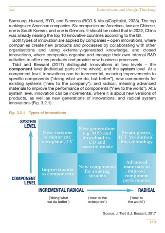 119Samsung, Huawei, BYD, and Siemens (BCG & VisualCapitalist, 2023). The toprankings are American companies. Six companies are American, two are Chinese,one is South Korean, and one is German. It should be noted that in 2022, Chinawas already nearing the top 10 innovative countries according to the GII.Both types of innovation are applied by companies %u2013 open innovations, wherecompanies create new products and processes by collaborating with otherorganisations and using externally-generated knowledge, and closedinnovations, where companies organise and manage their own internal R&Dactivities to offer new products and provide new business processes. Tidd and Bessant (2017) distinguish innovations at two levels %u2013 thecomponent level (individual parts of the whole), and the system level. At acomponent level, innovations can be incremental, meaning improvements tospecific components (%u201cdoing what we do, but better%u201d), new components forexisting systems (%u201cnew to the company%u201d), and radical, meaning advancedmaterials to improve the performance of components (%u201cnew to the world%u201d). At asystem level, innovation can be incremental, where it is about new versions ofproducts, as well as new generations of innovations, and radical systeminnovations (Fig. 3.2.1). Fig. 3.2.1 Types of innovationsSource: J. Tidd & J. Bessant, 2017INCREMENTAL RADICAL RADICALSYSTEMLEVEL COMPONENT LEVEL (%u2018doing what (%u2018new to the (%u2018new to we do better%u2019) enterprise%u2019) the world%u2019)3.2 Innovations and Design Thinking