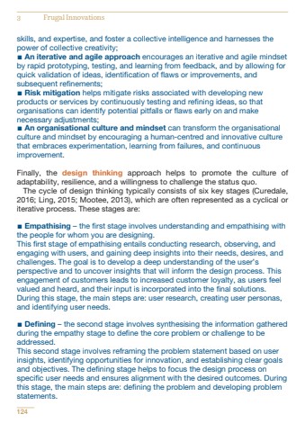 skills, and expertise, and foster a collective intelligence and harnesses thepower of collective creativity;%u25aa An iterative and agile approach encourages an iterative and agile mindsetby rapid prototyping, testing, and learning from feedback, and by allowing forquick validation of ideas, identification of flaws or improvements, andsubsequent refinements;%u25aa Risk mitigation helps mitigate risks associated with developing newproducts or services by continuously testing and refining ideas, so thatorganisations can identify potential pitfalls or flaws early on and makenecessary adjustments;%u25aa An organisational culture and mindset can transform the organisationalculture and mindset by encouraging a human-centred and innovative culturethat embraces experimentation, learning from failures, and continuousimprovement. Finally, the design thinking approach helps to promote the culture ofadaptability, resilience, and a willingness to challenge the status quo.The cycle of design thinking typically consists of six key stages (Curedale,2016; Ling, 2015; Mootee, 2013), which are often represented as a cyclical oriterative process. These stages are:%u25aa Empathising %u2013 the first stage involves understanding and empathising withthe people for whom you are designing.This first stage of empathising entails conducting research, observing, andengaging with users, and gaining deep insights into their needs, desires, andchallenges. The goal is to develop a deep understanding of the user%u2019sperspective and to uncover insights that will inform the design process. Thisengagement of customers leads to increased customer loyalty, as users feelvalued and heard, and their input is incorporated into the final solutions.During this stage, the main steps are: user research, creating user personas,and identifying user needs.%u25aa Defining %u2013 the second stage involves synthesising the information gatheredduring the empathy stage to define the core problem or challenge to beaddressed.This second stage involves reframing the problem statement based on userinsights, identifying opportunities for innovation, and establishing clear goalsand objectives. The defining stage helps to focus the design process onspecific user needs and ensures alignment with the desired outcomes. Duringthis stage, the main steps are: defining the problem and developing problemstatements.1243 Frugal Innovations