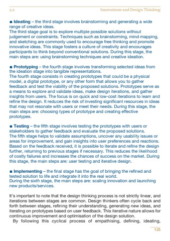 125%u25aa Ideating %u2013 the third stage involves brainstorming and generating a widerange of creative ideas.The third stage goal is to explore multiple possible solutions withoutjudgement or constraints. Techniques such as brainstorming, mind mapping,and sketching are commonly used to encourage free thinking and promoteinnovative ideas. This stage fosters a culture of creativity and encouragesparticipants to think beyond conventional solutions. During this stage, themain steps are: using brainstorming techniques and creative ideation.%u25aa Prototyping %u2013 the fourth stage involves transforming selected ideas fromthe ideation stage into tangible representations.The fourth stage consists in creating prototypes that could be a physicalmodel, a digital prototype, or any other form that allows you to gatherfeedback and test the viability of the proposed solutions. Prototypes serve asa means to explore and validate ideas, make design iterations, and gatherinsights from users. The focus is on quick and low-cost iterations to learn andrefine the design. It reduces the risk of investing significant resources in ideasthat may not resonate with users or meet their needs. During this stage, themain steps are: choosing types of prototype and creating effectiveprototypes.%u25aa Testing %u2013 the fifth stage involves testing the prototypes with users orstakeholders to gather feedback and evaluate the proposed solutions.The fifth stage helps to validate assumptions, uncover any usability issues orareas for improvement, and gain insights into user preferences and reactions.Based on the feedback received, it is possible to iterate and refine the designfurther, returning to previous stages if necessary. This reduces the likelihoodof costly failures and increases the chances of success on the market. Duringthis stage, the main steps are: user testing and iterative design.%u25aa Implementing %u2013 the final stage has the goal of bringing the refined andtested solution to life and integrate it into the real world.During the sixth stage, the main steps are: scaling innovation and launchingnew products/services.It%u2019s important to note that the design thinking process is not strictly linear, anditerations between stages are common. Design thinkers often cycle back andforth between stages, refining their understanding, generating new ideas, anditerating on prototypes based on user feedback. This iterative nature allows forcontinuous improvement and optimisation of the design solution.By following this cyclical process of empathising, defining, ideating,3.2 Innovations and Design Thinking