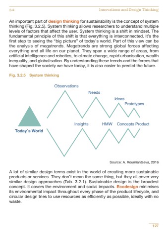 127An important part of design thinking for sustainability is the concept of systemthinking (Fig. 3.2.5). System thinking allows researchers to understand multiplelevels of factors that affect the user. System thinking is a shift in mindset. Thefundamental principle of this shift is that everything is interconnected. It%u2019s thefirst step to seeing the %u201cbig picture%u201d of today%u2019s world. Part of this view can bethe analysis of megatrends. Megatrends are strong global forces affectingeverything and all life on our planet. They span a wide range of areas, fromartificial intelligence and robotics, to climate change, rapid urbanisation, wealthinequality, and globalisation. By understanding these trends and the forces thathave shaped the society we have today, it is also easier to predict the future.Fig. 3.2.5 System thinkingSource: A. Roumiantseva, 2016 A lot of similar design terms exist in the world of creating more sustainableproducts or services. They don%u2019t mean the same thing, but they all cover verysimilar design approaches (Tab. 3.2.1). Sustainable design is the broadestconcept. It covers the environment and social impacts. Ecodesign minimisesits environmental impact throughout every phase of the product lifecycle, andcircular design tries to use resources as efficiently as possible, ideally with nowaste.Observations Needs Ideas PrototypesInsights HMW Concepts ProductToday%u00b4s World3.2 Innovations and Design Thinking