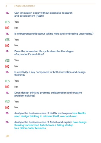 15. Can innovation occur without extensive research and development (R&D)?YesNo16. Is entrepreneurship about taking risks and embracing uncertainty?YesNo17. Does the innovation life cycle describe the stages of a product%u2019s evolution?YesNo18. Is creativity a key component of both innovation and design thinking?YesNo19. Does design thinking promote collaboration and creative problem-solving?YesNo20. Analyse the business case of Netflix and explain how Netflix used design thinking to reinvent itself, over and over.21. Analyse the business case of Airbnb and explain how design thinking transformed Airbnb from a failing startup to a billion-dollar business.1363 Frugal InnovationsYES NO YES NOYESNO YESNO YESNO