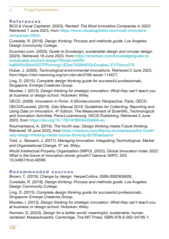 ReferencesBCG & Visual Capitalist. (2023). Ranked: The Most Innovative Companies in 2023.Retrieved 1 June 2023, from https://www.visualcapitalist.com/most-innovativecompanies-2023/.Curedale, R. (2016). Design thinking: Process and methods guide. Los Angeles:Design Community College.Ecochain.com. (2023). Guide to Ecodesign, sustainable design and circular design.(2023). Retrieved 18 June 2023, from https://ecochain.com/knowledge/guide-tosustainable-product-design/?fbclid=IwAR3Aa8WWo0btxHS37PPcmndg1JE5ex7kS6h6DDxEvcgbaJ_E1iTHnco27IIHuber, J. (2005). Technological environmental innovations. Retrieved 2 June 2023,from https://nbn-resolving.org/urn:nbn:de:0168-ssoar-114677.Ling, D. (2015). Complete design thinking guide for successful professionals.Singapore: Emerge Creatives Group.Mootee, I. (2013). Design thinking for strategic innovation: What they can%u2019t teach youat business or design school. Hoboken: Wiley. OECD. (2009). Innovation in Firms: A Microeconomic Perspective. Paris: OECD.OECD/Eurostat. (2018). Oslo Manual 2018: Guidelines for Collecting, Reporting andUsing Data on Innovation. 4th Edition. The Measurement of Scientific, Technologicaland Innovation Activities. Paris/Luxembourg: OECD Publishing. Retrieved 2 June2023, from https://doi.org/10.1787/9789264304604-en.Roumiantseva, A. (2016). The fourth way: Design thinking meets Future thinking.Retrieved 18 June 2023, from https://medium.com/@anna.roumiantseva/the-fourthway-design-thinking-meets-futures-thinking-85793ae3aa1eTidd, J., Bessant, J. (2017). Managing Innovation: Integrating Technological, Marketand Organizational Change. 5th ed. Wiley.World Intellectual Property Organization (WIPO). (2022). Global Innovation Index 2022:What is the future of innovation-driven growth? Geneva: WIPO. DOI10.34667/tind.46596.Recommended sourcesBrown, T. (2019). Change by design. HarperCollins. ISBN 0062856626.Curedale, R. (2016). Design thinking: Process and methods guide. Los Angeles:Design Community College.Ling, D. (2015). Complete design thinking guide for successful professionals.Singapore: Emerge Creatives Group.Mootee, I. (2013). Design thinking for strategic innovation: What they can%u2019t teach youat business or design school. Hoboken: Wiley. Norman, D. (2023). Design for a better world: meaningful, sustainable, humancentered. Massachusetts: Cambridge, The MIT Press. ISBN 978-0-262-04795-1.1383 Frugal Innovations