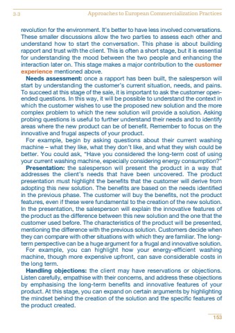revolution for the environment. It%u2019s better to have less involved conversations.These smaller discussions allow the two parties to assess each other andunderstand how to start the conversation. This phase is about buildingrapport and trust with the client. This is often a short stage, but it is essentialfor understanding the mood between the two people and enhancing theinteraction later on. This stage makes a major contribution to the customerexperience mentioned above.Needs assessment: once a rapport has been built, the salesperson willstart by understanding the customer%u2019s current situation, needs, and pains.To succeed at this stage of the sale, it is important to ask the customer openended questions. In this way, it will be possible to understand the context inwhich the customer wishes to use the proposed new solution and the morecomplex problem to which the new solution will provide a solution. Askingprobing questions is useful to further understand their needs and to identifyareas where the new product can be of benefit. Remember to focus on theinnovative and frugal aspects of your product.For example, begin by asking questions about their current washingmachine %u2013 what they like, what they don%u2019t like, and what they wish could bebetter. You could ask, %u201cHave you considered the long-term cost of usingyour current washing machine, especially considering energy consumption?%u201dPresentation: the salesperson will present the product in a way thataddresses the client%u2019s needs that have been uncovered. The productpresentation must highlight the benefits that the customer will derive fromadopting this new solution. The benefits are based on the needs identifiedin the previous phase. The customer will buy the benefits, not the productfeatures, even if these were fundamental to the creation of the new solution.In the presentation, the salesperson will explain the innovative features ofthe product as the difference between this new solution and the one that thecustomer used before. The characteristics of the product will be presented,mentioning the difference with the previous solution. Customers decide whenthey can compare with other situations with which they are familiar. The longterm perspective can be a huge argument for a frugal and innovative solution. For example, you can highlight how your energy-efficient washingmachine, though more expensive upfront, can save considerable costs inthe long term.Handling objections: the client may have reservations or objections.Listen carefully, empathise with their concerns, and address these objectionsby emphasising the long-term benefits and innovative features of yourproduct. At this stage, you can expand on certain arguments by highlightingthe mindset behind the creation of the solution and the specific features ofthe product created.1533.3 Approaches to European Commercialization Practices