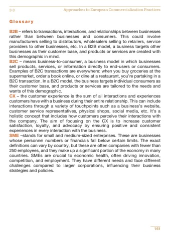 1613.3 Approaches to European Commercialization PracticesGlossaryB2B %u2013 refers to transactions, interactions, and relationships between businessesrather than between businesses and consumers. This could involvemanufacturers selling to distributors, wholesalers selling to retailers, serviceproviders to other businesses, etc. In a B2B model, a business targets otherbusinesses as their customer base, and products or services are created withthis demographic in mind.B2C %u2013 means business-to-consumer, a business model in which businessessell products, services, or information directly to end-users or consumers.Examples of B2C transactions are everywhere: when you buy groceries at thesupermarket, order a book online, or dine at a restaurant, you%u2019re partaking in aB2C transaction. In a B2C model, the business targets individual consumers astheir customer base, and products or services are tailored to the needs andwants of this demographic.CX %u2013 the customer experience is the sum of all interactions and experiencescustomers have with a business during their entire relationship. This can includeinteractions through a variety of touchpoints such as a business%u2019s website,customer service representatives, physical shops, social media, etc. It%u2019s aholistic concept that includes how customers perceive their interactions withthe company. The aim of focusing on the CX is to increase customersatisfaction, loyalty, and advocacy by ensuring positive and consistentexperiences in every interaction with the business.SME %u2013stands for small and medium-sized enterprises. These are businesseswhose personnel numbers or financials fall below certain limits. The exactdefinitions can vary by country, but these are often companies with fewer than250 employees, and they make up a significant portion of the economy in manycountries. SMEs are crucial to economic health, often driving innovation,competition, and employment. They have different needs and face differentchallenges compared to larger corporations, influencing their businessstrategies and policies.