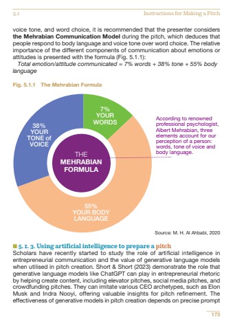 voice tone, and word choice, it is recommended that the presenter considersthe Mehrabian Communication Model during the pitch, which deduces thatpeople respond to body language and voice tone over word choice. The relativeimportance of the different components of communication about emotions orattitudes is presented with the formula (Fig. 5.1.1):Total emotion/attitude communicated = 7% words + 38% tone + 55% bodylanguageFig. 5.1.1 The Mehrabian FormulaSource: M. H. Al Ahbabi, 2020n 5. 1. 3. Using artificial intelligence to prepare a pitchScholars have recently started to study the role of artificial intelligence inentrepreneurial communication and the value of generative language modelswhen utilised in pitch creation. Short & Short (2023) demonstrate the role thatgenerative language models like ChatGPT can play in entrepreneurial rhetoricby helping create content, including elevator pitches, social media pitches, andcrowdfunding pitches. They can imitate various CEO archetypes, such as ElonMusk and Indra Nooyi, offering valuable insights for pitch refinement. Theeffectiveness of generative models in pitch creation depends on precise prompt1735.1 Instructions for Making a Pitch38% YOUR TONE of VOICE7% YOUR WORDS55% YOUR BODY LANGUAGEAccording to renownedprofessional psychologist,Albert Mehrabian, threeelements account for ourperception of a person:words, tone of voice andbody language. THEMEHRABIANFORMULA