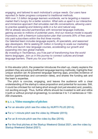 1755.1 Instructions for Making a Pitchengaging, and tailored to each individual%u2019s unique needs. Our users havereported 2x faster progress compared to traditional methods.With over 1.5 billion language learners worldwide, we%u2019re targeting a massivemarket that%u2019s hungry for a better solution. What sets us apart is our interactiveand immersive approach that simulates real-life conversations, allowing usersto practise speaking and listening skills in a fun and natural way.We%u2019ve already secured partnerships with renowned language institutes,gaining access to millions of potential users. And our revenue model is equallyimpressive, with a freemium subscription plan that converts 30% of free usersinto paid subscribers within the first three months.Our talented team includes language experts, AI specialists, and seasonedapp developers. We%u2019re seeking $1 million in funding to scale our marketingefforts and launch new language courses, accelerating our growth andexpanding into new global markets.By investing in TechGenius, you%u2019ll be part of transforming how the worldlearns languages. Join us in this journey to connect cultures and breaklanguage barriers. Thank you for your time.%u201dIn this elevator pitch, the presenter introduces the start-up, clearly explains theproblem they are solving (inefficient language learning methods), highlights theirunique solution (an AI-powered language learning app), provides evidence oftraction (partnerships and conversion rates), and shares the funding ask andthe team%u2019s expertise. The pitch is concise, engaging, and leaves the audience with a clearunderstanding of the startup%u2019s value proposition and potential for success. Still,it could be criticised for not being short enough (not just elevator) and, possibly,not exciting enough. Thus, further efforts should be invested to edit and refineit (with or without prompt engineering), to condense it to 1%u20132 sentences or 150%u2013200 characters.n 5. 1. 5. Video examples of pitches%u25aa For an elevator pitch see the video by NURTV PLUS (2014);%u25aa For a 1-minute pitch see the video by Wheeler (2015);%u25aa For an 8-minute pitch see the video by Bax (2016);%u25aa For the final pitches at the Startup Weekend Global 2021, see the video byStartup Weekend Global (2021).