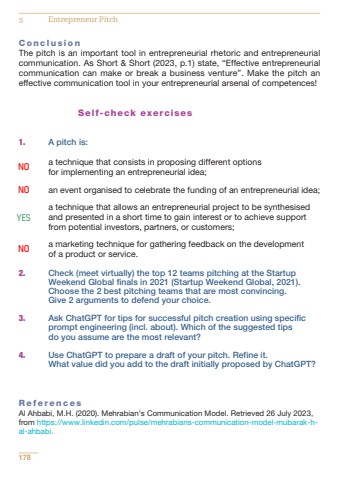 Conclusion The pitch is an important tool in entrepreneurial rhetoric and entrepreneurialcommunication. As Short & Short (2023, p.1) state, %u201cEffective entrepreneurialcommunication can make or break a business venture%u201d. Make the pitch aneffective communication tool in your entrepreneurial arsenal of competences!Self-check exercises1. A pitch is:a technique that consists in proposing different options for implementing an entrepreneurial idea;an event organised to celebrate the funding of an entrepreneurial idea;a technique that allows an entrepreneurial project to be synthesised and presented in a short time to gain interest or to achieve support from potential investors, partners, or customers;a marketing technique for gathering feedback on the development of a product or service.2. Check (meet virtually) the top 12 teams pitching at the StartupWeekend Global finals in 2021 (Startup Weekend Global, 2021).Choose the 2 best pitching teams that are most convincing. Give 2 arguments to defend your choice.3. Ask ChatGPT for tips for successful pitch creation using specificprompt engineering (incl. about). Which of the suggested tips do you assume are the most relevant? 4. Use ChatGPT to prepare a draft of your pitch. Refine it. What value did you add to the draft initially proposed by ChatGPT?ReferencesAl Ahbabi, M.H. (2020). Mehrabian%u2019s Communication Model. Retrieved 26 July 2023,from https://www.linkedin.com/pulse/mehrabians-communication-model-mubarak-hal-ahbabi. 1785 Entrepreneur PitchNONO YES NO