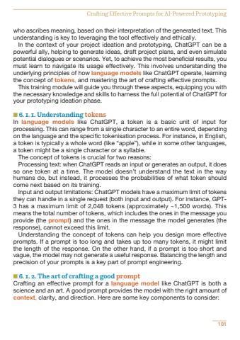 who ascribes meaning, based on their interpretation of the generated text. Thisunderstanding is key to leveraging the tool effectively and ethically.In the context of your project ideation and prototyping, ChatGPT can be apowerful ally, helping to generate ideas, draft project plans, and even simulatepotential dialogues or scenarios. Yet, to achieve the most beneficial results, youmust learn to navigate its usage effectively. This involves understanding theunderlying principles of how language models like ChatGPT operate, learningthe concept of tokens, and mastering the art of crafting effective prompts.This training module will guide you through these aspects, equipping you withthe necessary knowledge and skills to harness the full potential of ChatGPT foryour prototyping ideation phase.n 6. 1. 1. Understanding tokensIn language models like ChatGPT, a token is a basic unit of input forprocessing. This can range from a single character to an entire word, dependingon the language and the specific tokenisation process. For instance, in English,a token is typically a whole word (like %u201capple%u201d), while in some other languages,a token might be a single character or a syllable.The concept of tokens is crucial for two reasons:Processing text: when ChatGPT reads an input or generates an output, it doesso one token at a time. The model doesn%u2019t understand the text in the wayhumans do, but instead, it processes the probabilities of what token shouldcome next based on its training.Input and output limitations: ChatGPT models have a maximum limit of tokensthey can handle in a single request (both input and output). For instance, GPT3 has a maximum limit of 2,048 tokens (approximately ~1,500 words). Thismeans the total number of tokens, which includes the ones in the message youprovide (the prompt) and the ones in the message the model generates (theresponse), cannot exceed this limit.Understanding the concept of tokens can help you design more effectiveprompts. If a prompt is too long and takes up too many tokens, it might limitthe length of the response. On the other hand, if a prompt is too short andvague, the model may not generate a useful response. Balancing the length andprecision of your prompts is a key part of prompt engineering.n 6. 1. 2. The art of crafting a good promptCrafting an effective prompt for a language model like ChatGPT is both ascience and an art. A good prompt provides the model with the right amount ofcontext, clarity, and direction. Here are some key components to consider:181Crafting Effective Prompts for AI-Powered Prototyping