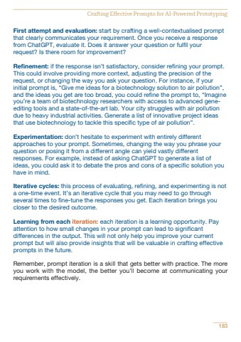 First attempt and evaluation: start by crafting a well-contextualised promptthat clearly communicates your requirement. Once you receive a responsefrom ChatGPT, evaluate it. Does it answer your question or fulfil yourrequest? Is there room for improvement?Refinement: if the response isn%u2019t satisfactory, consider refining your prompt.This could involve providing more context, adjusting the precision of therequest, or changing the way you ask your question. For instance, if yourinitial prompt is, %u201cGive me ideas for a biotechnology solution to air pollution%u201d,and the ideas you get are too broad, you could refine the prompt to, %u201cImagineyou%u2019re a team of biotechnology researchers with access to advanced geneediting tools and a state-of-the-art lab. Your city struggles with air pollutiondue to heavy industrial activities. Generate a list of innovative project ideasthat use biotechnology to tackle this specific type of air pollution%u201d.Experimentation: don%u2019t hesitate to experiment with entirely differentapproaches to your prompt. Sometimes, changing the way you phrase yourquestion or posing it from a different angle can yield vastly differentresponses. For example, instead of asking ChatGPT to generate a list ofideas, you could ask it to debate the pros and cons of a specific solution youhave in mind.Iterative cycles: this process of evaluating, refining, and experimenting is nota one-time event. It%u2019s an iterative cycle that you may need to go throughseveral times to fine-tune the responses you get. Each iteration brings youcloser to the desired outcome.Learning from each iteration: each iteration is a learning opportunity. Payattention to how small changes in your prompt can lead to significantdifferences in the output. This will not only help you improve your currentprompt but will also provide insights that will be valuable in crafting effectiveprompts in the future.Remember, prompt iteration is a skill that gets better with practice. The moreyou work with the model, the better you%u2019ll become at communicating yourrequirements effectively.183Crafting Effective Prompts for AI-Powered Prototyping