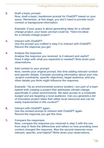 2. Draft a basic prompt:Now, draft a basic, barebones prompt for ChatGPT based on your query. Remember, at this stage, you don%u2019t need to provide much context or background information.Example: if your query is about generating ideas for a climate change project, your basic prompt could be, %u201cGive me ideas for a climate change project%u201d.3. Interact with ChatGPT:Use the prompt you crafted in step 2 to interact with ChatGPT. Record the response you get.4. Analyse the response:Analyse the response you received. Is it relevant and useful? Does it align with what you expected or needed? Note down your observations.5. Add context to your prompt:Now, rewrite your original prompt, this time adding relevant contextand specific details. Consider providing information about your role, project constraints, specific objectives, target audience, and any other details you think might influence the response.Example: %u201cAs an environmental science student, I am part of a teamtasked with creating a project that addresses climate change specifically in urban environments. We have access to a moderatebudget and are targeting a local audience. Can you generate a list of innovative project ideas that utilise local resources and can be easily implemented in this context?%u201d6. Interact with ChatGPT again:Use the revised prompt to interact with ChatGPT again. Record the response you get this time.7. Compare the responses:Now, compare the response you received in step 3 with the one from step 6. Note the differences and reflect on how providing morecontext changed the response. Was the second response more relevant, specific, and helpful? Write down your observations.185Crafting Effective Prompts for AI-Powered Prototyping