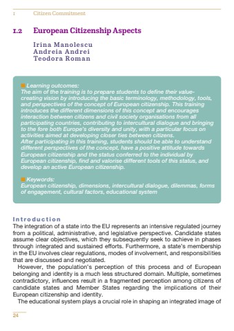 241 Citizen Commitment1.2 European Citizenship AspectsIrina Manolescu Andreia Andrei Teodora Romann Learning outcomes: The aim of the training is to prepare students to define their valuecreating vision by introducing the basic terminology, methodology, tools,and perspectives of the concept of European citizenship. This trainingintroduces the different dimensions of this concept and encouragesinteraction between citizens and civil society organisations from allparticipating countries, contributing to intercultural dialogue and bringingto the fore both Europe%u2019s diversity and unity, with a particular focus onactivities aimed at developing closer ties between citizens.After participating in this training, students should be able to understanddifferent perspectives of the concept, have a positive attitude towardsEuropean citizenship and the status conferred to the individual byEuropean citizenship, find and valorise different tools of this status, anddevelop an active European citizenship.n Keywords:European citizenship, dimensions, intercultural dialogue, dilemmas, formsof engagement, cultural factors, educational systemIntroduction The integration of a state into the EU represents an intensive regulated journeyfrom a political, administrative, and legislative perspective. Candidate statesassume clear objectives, which they subsequently seek to achieve in phasesthrough integrated and sustained efforts. Furthermore, a state%u2019s membershipin the EU involves clear regulations, modes of involvement, and responsibilitiesthat are discussed and negotiated.However, the population%u2019s perception of this process and of Europeanbelonging and identity is a much less structured domain. Multiple, sometimescontradictory, influences result in a fragmented perception among citizens ofcandidate states and Member States regarding the implications of theirEuropean citizenship and identity.The educational system plays a crucial role in shaping an integrated image of