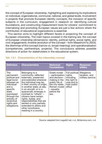the concept of European citizenship, highlighting and explaining its implicationson individual, organizational, communal, national, and global levels. Involvementin projects that promote European identity concepts, the inclusion of specificsubjects in the curriculum, engagement in research on identifying culturalfoundations, and constructing measurement tools for citizens%u2019 commitment tointernalizing and promoting European values are just a few actions where thecontribution of educational organizations is essential.This section aims to highlight different facets in projecting the concept ofEuropean citizenship. The main topics covered in the training are: the conceptof European citizenship (dimensions: identity, political rights, social rights, andcivic engagement); timeline (evolution of the concept %u2013 from Maastricht to 2023);the dilemmas of the concept (narrow vs. broad meaning); and operationalisation(competences, partnerships, projects). The conclusions address possibledirections of action for stakeholders in the educational system.Tab. 1.2.1 Characteristics of the citizenship conceptSource: adapted from LegeAZ.net, n.d.; Britannica.com, n.d.251.2 European Citizenship AspectsDefinition Characteristics HistoricalFoundationsRights ResponsibilitiesThepermanentpolitical andlegal bondbetween anindividualand aspecificstate,expressedthrough theentirety ofreciprocalrights andobligations.Belonging to acommunity; reflectedexternally, preserved, and extended whereverthe individual may be, in their country of origin, in another state, at sea, in an aircraft, or in aspacecraft; emerges incontrast to %u201cothers%u201d %u2013citizens have certainrights, duties, andresponsibilities that aredenied or only partiallyextended to aliens andother noncitizensresiding in a country.Greek model%u2013 participationand decisionmaking in thepublic life ofthe city-state;Roman model%u2013 equalitybefore thelaw.Full politicalrights,includingthe right tovote and tohold publicofficeAllegiance,taxation, andmilitary service