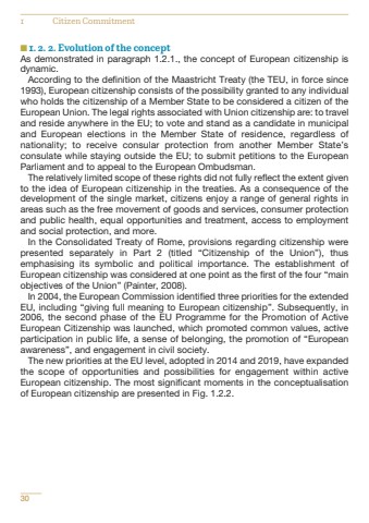 30n 1. 2. 2. Evolution of the conceptAs demonstrated in paragraph 1.2.1., the concept of European citizenship isdynamic.According to the definition of the Maastricht Treaty (the TEU, in force since1993), European citizenship consists of the possibility granted to any individualwho holds the citizenship of a Member State to be considered a citizen of theEuropean Union. The legal rights associated with Union citizenship are: to traveland reside anywhere in the EU; to vote and stand as a candidate in municipaland European elections in the Member State of residence, regardless ofnationality; to receive consular protection from another Member State%u2019sconsulate while staying outside the EU; to submit petitions to the EuropeanParliament and to appeal to the European Ombudsman.The relatively limited scope of these rights did not fully reflect the extent givento the idea of European citizenship in the treaties. As a consequence of thedevelopment of the single market, citizens enjoy a range of general rights inareas such as the free movement of goods and services, consumer protectionand public health, equal opportunities and treatment, access to employmentand social protection, and more. In the Consolidated Treaty of Rome, provisions regarding citizenship werepresented separately in Part 2 (titled %u201cCitizenship of the Union%u201d), thusemphasising its symbolic and political importance. The establishment ofEuropean citizenship was considered at one point as the first of the four %u201cmainobjectives of the Union%u201d (Painter, 2008). In 2004, the European Commission identified three priorities for the extendedEU, including %u201cgiving full meaning to European citizenship%u201d. Subsequently, in2006, the second phase of the EU Programme for the Promotion of ActiveEuropean Citizenship was launched, which promoted common values, activeparticipation in public life, a sense of belonging, the promotion of %u201cEuropeanawareness%u201d, and engagement in civil society.The new priorities at the EU level, adopted in 2014 and 2019, have expandedthe scope of opportunities and possibilities for engagement within activeEuropean citizenship. The most significant moments in the conceptualisationof European citizenship are presented in Fig. 1.2.2.1 Citizen Commitment