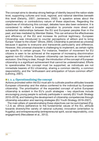 The concept aims to develop strong feelings of identity beyond the nation-statelevel, supporting cultures and local, regional, and national identities beneaththis level (Delanty, 2007; Jamienson, 2002). A question arises about thecomplementary or contradictory nature of these objectives. Regarding theobjectives of introducing this concept, debates have also been extensive. It isconsidered to reflect a broader aspiration to promote more direct andsubstantial relationships between the EU and European peoples than in thepast, and less mediated by Member States. This can enhance the effectivenessand efficiency of the EU and increase its political legitimacy. EuropeanCitizenship was introduced to counter perceptions of elitism and to bringEurope %u201ccloser to the citizen%u201d (Shore, 2004). Citizenship is perceived as universalbecause it applies to everyone and transcends particularity and difference.However, this universal character is challenging to implement, as certain rightsare specific to certain groups. For instance, freedom of movement for EUcitizens is seen to be achieved at the expense of increasing discriminationagainst non-EU citizens. European citizenship can become an instrument ofexclusion. One thing is clear, though: the introduction of the concept of Europeancitizenship is a significant achievement that cannot be underestimated. Effortsto operationalise this concept must be supported, as individuals are notimmediate bearers of EU citizenship, sharing a common identity, a commonresponsibility, and the %u201centhusiasm and anticipation of future common effort%u201d(Lehning, 2001).n 1. 2. 4. Operationalising the conceptActions promoted within the EU must aim to cultivate positive attitudes towardsEuropean citizenship and the status conferred to the individual by Europeancitizenship. The prioritisation of the expanded concept of active Europeancitizenship is evident in the EU%u2019s youth strategies %u2013 key objectives includeencouraging young people to actively participate in society (EU Youth Strategy2010%u20132018), and fostering the development of citizenship competencies throughcitizenship education and learning strategies (EU Youth Strategy 2019%u20132027).The main pillars of operationalising these objectives can be summarised (Fig.1.2.4) as: ethics (adherence to the fundamental values of the EU, attitudetowards diversity/the variety of national cultures); innovation (orientation tofrugality); and entrepreneurship (entrepreneurial spirit, social responsibility, civicengagement) (Necul%u0103esei et al., 2012). 341 Citizen Commitment