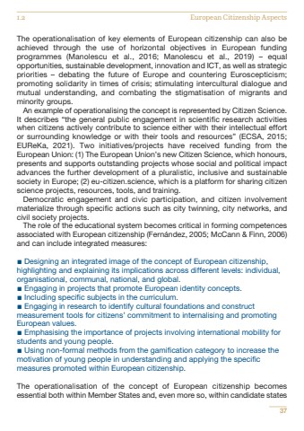 The operationalisation of key elements of European citizenship can also beachieved through the use of horizontal objectives in European fundingprogrammes (Manolescu et al., 2016; Manolescu et al., 2019) %u2013 equalopportunities, sustainable development, innovation and ICT, as well as strategicpriorities %u2013 debating the future of Europe and countering Euroscepticism;promoting solidarity in times of crisis; stimulating intercultural dialogue andmutual understanding, and combating the stigmatisation of migrants andminority groups.An example of operationalising the concept is represented by Citizen Science.It describes %u201cthe general public engagement in scientific research activitieswhen citizens actively contribute to science either with their intellectual effortor surrounding knowledge or with their tools and resources%u201d (ECSA, 2015;EUReKa, 2021). Two initiatives/projects have received funding from theEuropean Union: (1) The European Union%u2019s new Citizen Science, which honours,presents and supports outstanding projects whose social and political impactadvances the further development of a pluralistic, inclusive and sustainablesociety in Europe; (2) eu-citizen.science, which is a platform for sharing citizenscience projects, resources, tools, and training.Democratic engagement and civic participation, and citizen involvementmaterialize through specific actions such as city twinning, city networks, andcivil society projects.The role of the educational system becomes critical in forming competencesassociated with European citizenship (Fern%u00e1ndez, 2005; McCann & Finn, 2006)and can include integrated measures:%u25aa Designing an integrated image of the concept of European citizenship,highlighting and explaining its implications across different levels: individual,organisational, communal, national, and global.%u25aa Engaging in projects that promote European identity concepts.%u25aa Including specific subjects in the curriculum.%u25aa Engaging in research to identify cultural foundations and constructmeasurement tools for citizens%u2019 commitment to internalising and promotingEuropean values.%u25aa Emphasising the importance of projects involving international mobility forstudents and young people.%u25aa Using non-formal methods from the gamification category to increase themotivation of young people in understanding and applying the specificmeasures promoted within European citizenship.The operationalisation of the concept of European citizenship becomesessential both within Member States and, even more so, within candidate states371.2 European Citizenship Aspects