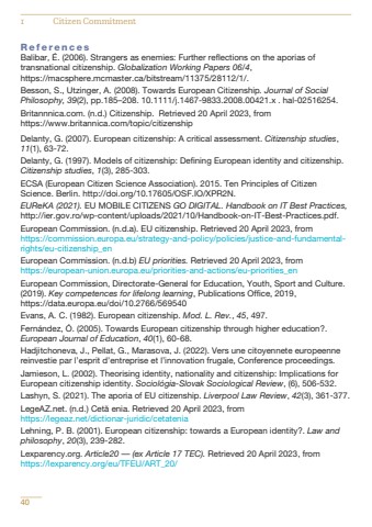 ReferencesBalibar, %u00c9. (2006). Strangers as enemies: Further reflections on the aporias oftransnational citizenship. Globalization Working Papers 06/4,https://macsphere.mcmaster.ca/bitstream/11375/28112/1/.Besson, S., Utzinger, A. (2008). Towards European Citizenship. Journal of SocialPhilosophy, 39(2), pp.185%u2013208. 10.1111/j.1467-9833.2008.00421.x . hal-02516254.Britannnica.com. (n.d.) Citizenship. Retrieved 20 April 2023, fromhttps://www.britannica.com/topic/citizenshipDelanty, G. (2007). European citizenship: A critical assessment. Citizenship studies,11(1), 63-72.Delanty, G. (1997). Models of citizenship: Defining European identity and citizenship.Citizenship studies, 1(3), 285-303.ECSA (European Citizen Science Association). 2015. Ten Principles of CitizenScience. Berlin. http://doi.org/10.17605/OSF.IO/XPR2N.EUReKA (2021). EU MOBILE CITIZENS GO DIGITAL. Handbook on IT Best Practices,http://ier.gov.ro/wp-content/uploads/2021/10/Handbook-on-IT-Best-Practices.pdf.European Commission. (n.d.a). EU citizenship. Retrieved 20 April 2023, fromhttps://commission.europa.eu/strategy-and-policy/policies/justice-and-fundamentalrights/eu-citizenship_enEuropean Commission. (n.d.b) EU priorities. Retrieved 20 April 2023, fromhttps://european-union.europa.eu/priorities-and-actions/eu-priorities_enEuropean Commission, Directorate-General for Education, Youth, Sport and Culture.(2019). Key competences for lifelong learning, Publications Office, 2019,https://data.europa.eu/doi/10.2766/569540Evans, A. C. (1982). European citizenship. Mod. L. Rev., 45, 497.Fern%u00e1ndez, %u00d3. (2005). Towards European citizenship through higher education?.European Journal of Education, 40(1), 60-68.Hadjitchoneva, J., Pellat, G., Marasova, J. (2022). Vers une citoyennete europeennereinvestie par l%u2019esprit d%u2019entreprise et l%u2019innovation frugale, Conference proceedings.Jamieson, L. (2002). Theorising identity, nationality and citizenship: Implications forEuropean citizenship identity. Sociol%u00f3gia-Slovak Sociological Review, (6), 506-532.Lashyn, S. (2021). The aporia of EU citizenship. Liverpool Law Review, 42(3), 361-377.LegeAZ.net. (n.d.) Cet%u0103 enia. Retrieved 20 April 2023, fromhttps://legeaz.net/dictionar-juridic/cetateniaLehning, P. B. (2001). European citizenship: towards a European identity?. Law andphilosophy, 20(3), 239-282.Lexparency.org. Article20 %u2014 (ex Article 17 TEC). Retrieved 20 April 2023, fromhttps://lexparency.org/eu/TFEU/ART_20/401 Citizen Commitment