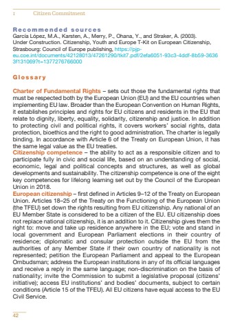 Recommended sourcesGarc%u00eda L%u00f3pez, M.A., Karsten, A., Merry, P., Ohana, Y., and Straker, A. (2003).Under Construction. Citizenship, Youth and Europe T-Kit on European Citizenship,Strasbourg: Council of Europe publishing, https://pjpeu.coe.int/documents/42128013/47261290/tkit7.pdf/2efa6051-93c3-4ddf-8b59-36363f131069?t=1377276766000GlossaryCharter of Fundamental Rights %u2013 sets out those the fundamental rights thatmust be respected both by the European Union (EU) and the EU countries whenimplementing EU law. Broader than the European Convention on Human Rights,it establishes principles and rights for EU citizens and residents in the EU thatrelate to dignity, liberty, equality, solidarity, citizenship and justice. In additionto protecting civil and political rights, it covers workers%u2019 social rights, dataprotection, bioethics and the right to good administration. The charter is legallybinding. In accordance with Article 6 of the Treaty on European Union, it hasthe same legal value as the EU treaties.Citizenship competence %u2013 the ability to act as a responsible citizen and toparticipate fully in civic and social life, based on an understanding of social,economic, legal and political concepts and structures, as well as globaldevelopments and sustainability. The citizenship competence is one of the eightkey competences for lifelong learning set out by the Council of the EuropeanUnion in 2018.European citizenship %u2013 first defined in Articles 9%u201312 of the Treaty on EuropeanUnion. Articles 18%u201325 of the Treaty on the Functioning of the European Union(the TFEU) set down the rights resulting from EU citizenship. Any national of anEU Member State is considered to be a citizen of the EU. EU citizenship doesnot replace national citizenship, it is an addition to it. Citizenship gives them theright to: move and take up residence anywhere in the EU; vote and stand inlocal government and European Parliament elections in their country ofresidence; diplomatic and consular protection outside the EU from theauthorities of any Member State if their own country of nationality is notrepresented; petition the European Parliament and appeal to the EuropeanOmbudsman; address the European institutions in any of its official languagesand receive a reply in the same language; non-discrimination on the basis ofnationality; invite the Commission to submit a legislative proposal (citizens%u2019initiative); access EU institutions%u2019 and bodies%u2019 documents, subject to certainconditions (Article 15 of the TFEU). All EU citizens have equal access to the EUCivil Service.421 Citizen Commitment