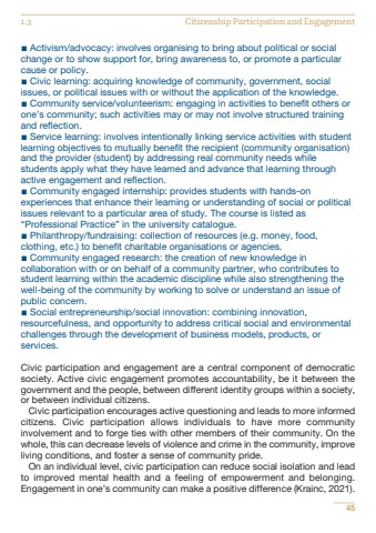 %u25aa Activism/advocacy: involves organising to bring about political or socialchange or to show support for, bring awareness to, or promote a particularcause or policy.%u25aa Civic learning: acquiring knowledge of community, government, socialissues, or political issues with or without the application of the knowledge.%u25aa Community service/volunteerism: engaging in activities to benefit others orone%u2019s community; such activities may or may not involve structured trainingand reflection.%u25aa Service learning: involves intentionally linking service activities with studentlearning objectives to mutually benefit the recipient (community organisation)and the provider (student) by addressing real community needs whilestudents apply what they have learned and advance that learning throughactive engagement and reflection.%u25aa Community engaged internship: provides students with hands-onexperiences that enhance their learning or understanding of social or politicalissues relevant to a particular area of study. The course is listed as%u201cProfessional Practice%u201d in the university catalogue.%u25aa Philanthropy/fundraising: collection of resources (e.g. money, food,clothing, etc.) to benefit charitable organisations or agencies.%u25aa Community engaged research: the creation of new knowledge incollaboration with or on behalf of a community partner, who contributes tostudent learning within the academic discipline while also strengthening thewell-being of the community by working to solve or understand an issue ofpublic concern.%u25aa Social entrepreneurship/social innovation: combining innovation,resourcefulness, and opportunity to address critical social and environmentalchallenges through the development of business models, products, orservices.Civic participation and engagement are a central component of democraticsociety. Active civic engagement promotes accountability, be it between thegovernment and the people, between different identity groups within a society,or between individual citizens.Civic participation encourages active questioning and leads to more informedcitizens. Civic participation allows individuals to have more communityinvolvement and to forge ties with other members of their community. On thewhole, this can decrease levels of violence and crime in the community, improveliving conditions, and foster a sense of community pride.On an individual level, civic participation can reduce social isolation and leadto improved mental health and a feeling of empowerment and belonging.Engagement in one%u2019s community can make a positive difference (Krainc, 2021).451.3 Citizenship Participation and Engagement