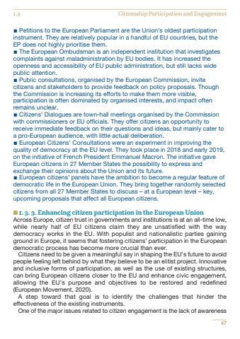 %u25aa Petitions to the European Parliament are the Union%u2019s oldest participationinstrument. They are relatively popular in a handful of EU countries, but theEP does not highly prioritise them. %u25aa The European Ombudsman is an independent institution that investigatescomplaints against maladministration by EU bodies. It has increased theopenness and accessibility of EU public administration, but still lacks widepublic attention. %u25aa Public consultations, organised by the European Commission, invitecitizens and stakeholders to provide feedback on policy proposals. Thoughthe Commission is increasing its efforts to make them more visible,participation is often dominated by organised interests, and impact oftenremains unclear. %u25aa Citizens%u2019 Dialogues are town-hall meetings organised by the Commissionwith commissioners or EU officials. They offer citizens an opportunity toreceive immediate feedback on their questions and ideas, but mainly cater toa pro-European audience, with little actual deliberation. %u25aa European Citizens%u2019 Consultations were an experiment in improving thequality of democracy at the EU level. They took place in 2018 and early 2019,on the initiative of French President Emmanuel Macron. The initiative gaveEuropean citizens in 27 Member States the possibility to express andexchange their opinions about the Union and its future.%u25aa European citizens%u2019 panels have the ambition to become a regular feature ofdemocratic life in the European Union. They bring together randomly selectedcitizens from all 27 Member States to discuss %u2013 at a European level %u2013 key,upcoming proposals that affect all European citizens.n 1. 3. 3. Enhancing citizen participation in the European UnionAcross Europe, citizen trust in governments and institutions is at an all-time low,while nearly half of EU citizens claim they are unsatisfied with the waydemocracy works in the EU. With populist and nationalistic parties gainingground in Europe, it seems that fostering citizens%u2019 participation in the Europeandemocratic process has become more crucial than ever.Citizens need to be given a meaningful say in shaping the EU%u2019s future to avoidpeople feeling left behind by what they believe to be an elitist project. Innovativeand inclusive forms of participation, as well as the use of existing structures,can bring European citizens closer to the EU and enhance civic engagement,allowing the EU%u2019s purpose and objectives to be restored and redefined(European Movement, 2020).A step toward that goal is to identify the challenges that hinder theeffectiveness of the existing instruments.One of the major issues related to citizen engagement is the lack of awareness471.3 Citizenship Participation and Engagement