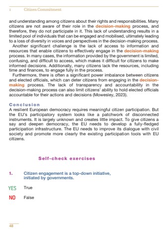 48and understanding among citizens about their rights and responsibilities. Manycitizens are not aware of their role in the decision-making process, andtherefore, they do not participate in it. This lack of understanding results in alimited pool of individuals that can be engaged and mobilised, ultimately leadingto a loss of diversity in voices and perspectives in the decision-making process.Another significant challenge is the lack of access to information andresources that enable citizens to effectively engage in the decision-makingprocess. In many cases, the information provided by the government is limited,confusing, and difficult to access, which makes it difficult for citizens to makeinformed decisions. Additionally, many citizens lack the resources, includingtime and finances, to engage fully in the process.Furthermore, there is often a significant power imbalance between citizensand elected officials, which can deter citizens from engaging in the decisionmaking process. The lack of transparency and accountability in thedecision-making process can also limit citizens%u2019 ability to hold elected officialsaccountable for their actions and decisions (Mowesley, 2023).Conclusion A resilient European democracy requires meaningful citizen participation. Butthe EU%u2019s participatory system looks like a patchwork of disconnectedinstruments. It is largely unknown and creates little impact. To give citizens asay and deepen democracy, the EU needs to develop a fully-fledgedparticipation infrastructure. The EU needs to improve its dialogue with civilsociety and promote more clearly the existing participation tools with EUcitizens.Self-check exercises1. Citizen engagement is a top-down initiative, initiated by governments. TrueFalse1 Citizen CommitmentYES NO