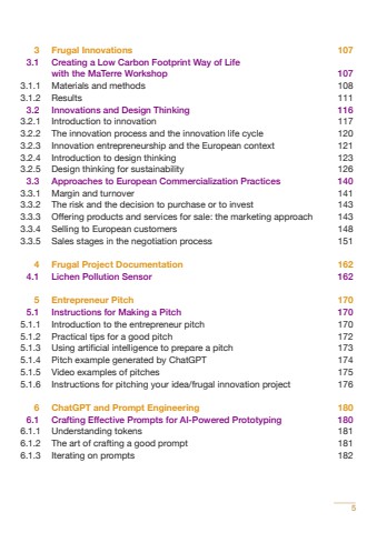 3 Frugal Innovations 107 3.1 Creating a Low Carbon Footprint Way of Life with the MaTerre Workshop 1073.1.1 Materials and methods 1083.1.2 Results 111 3.2 Innovations and Design Thinking 1163.2.1 Introduction to innovation 1173.2.2 The innovation process and the innovation life cycle 1203.2.3 Innovation entrepreneurship and the European context 1213.2.4 Introduction to design thinking 1233.2.5 Design thinking for sustainability 126 3.3 Approaches to European Commercialization Practices 1403.3.1 Margin and turnover 1413.3.2 The risk and the decision to purchase or to invest 1433.3.3 Offering products and services for sale: the marketing approach 1433.3.4 Selling to European customers 1483.3.5 Sales stages in the negotiation process 151 4 Frugal Project Documentation 162 4.1 Lichen Pollution Sensor 162 5 Entrepreneur Pitch 170 5.1 Instructions for Making a Pitch 1705.1.1 Introduction to the entrepreneur pitch 1705.1.2 Practical tips for a good pitch 1725.1.3 Using artificial intelligence to prepare a pitch 1735.1.4 Pitch example generated by ChatGPT 1745.1.5 Video examples of pitches 1755.1.6 Instructions for pitching your idea/frugal innovation project 176 6 ChatGPT and Prompt Engineering 180 6.1 Crafting Effective Prompts for AI-Powered Prototyping 1806.1.1 Understanding tokens 1816.1.2 The art of crafting a good prompt 1816.1.3 Iterating on prompts 1825