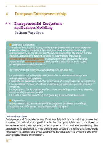 522 European Entrepreneurship2 European Entrepreneurship2.1. Entrepreneurial Ecosystems and Business ModellingJuliana Vassileva n Learning outcomes: The aim of this course is to provide participants with a comprehensiveunderstanding of the principles and practices of entrepreneurship,entrepreneurial ecosystems, and business modelling. By the end of thetraining, participants should be able to understand the role ofentrepreneurial ecosystems in supporting new ventures, developa successful business model, and create a plan for launching andgrowing a successful business.By the end of this training, participants will be able to:y Understand the principles and practices of entrepreneurship andentrepreneurial ecosystems.y Identify the elements and characteristics of entrepreneurial ecosystems.y Understand the role of entrepreneurial ecosystems in supporting newventures.y Understand the importance of business modelling and how to developa successful business model.y Create a plan for launching and growing a successful business.n Keywords:entrepreneurship, entrepreneurial ecosystem, business modelling,business model canvas, entrepreneurial strategiesIntroduction Entrepreneurial Ecosystems and Business Modelling is a training course thatfocuses on introducing participants to the principles and practices ofentrepreneurship, entrepreneurial ecosystems, and business modelling. Theprogramme is designed to help participants develop the skills and knowledgenecessary to launch and grow successful businesses in a dynamic and everchanging business environment. Entrepreneurial Ecosystemsand Business Modelling