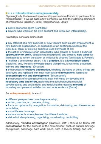 n 2. 1. 1. Introduction to entrepreneurshipEtymologically, the term entrepreneurship comes from French, in particular from%u201centreprendre%u201d. If we go back a few centuries, we find the following definitionsof entrepreneur (Janssen, 2016; Hadjitchoneva, 2022):%u25aa active economic agent (Cantillon); %u25aa anyone who works on his own account and in his own interest (Say).Nowadays, scholars define it as:%u25aa any attempt at a new business or new venture such as self-employment, anew business organisation, or expansion of an existing business at theindividual, team, or existing business level (Reynolds et al.);%u25aa the action or initiative of an individual(s) who creates or seizes a businessopportunity for profit, establishing enterprise(s) and creating new value forthird parties to whom the action or initiative is directed (Verstraete & Fayolle);%u25aa %u201cneither a science nor an art. It is a practice. It is a knowledge-baseddiscipline, and, like all knowledge-based disciplines, it has to be practised,learned and improved%u201d (Drucker);%u25aa the process of creative destruction, whereby old ways of doing things aredestroyed and replaced with new methods and innovations, leading toeconomic growth and development (Schumpeter);%u25aa the process of creating something new with value by devoting thenecessary time and effort, assuming the accompanying financial,psychological, and social risks, and receiving the resulting rewards ofmonetary and personal satisfaction and independence (Burns).So, entrepreneurship is about:%u25aa different perspectives on entrepreneurship; %u25aa action, practice, art, process, doing;%u25aa focus on opportunity recognition, innovation, risk-taking, and the resourcesto mobilise; %u25aa a multifaceted concept; %u25aa various aspects as emphasised by different authors;%u25aa vision but also planning, organising, coordinating, controlling.Additionally, %u201chidden advantages%u201d (Gladwell, 2011) should be taken intoconsideration for the success of the entrepreneur, such as cultural heritage,background, patronage, hard work, place, rules in society, timing, and luck.532.1 Entrepreneurial Ecosystems and Business Modelling
