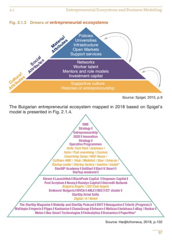 Fig. 2.1.3 Drivers of entrepreneurial ecosystemsSource: Spigel, 2015, p.9The Bulgarian entrepreneurial ecosystem mapped in 2018 based on Spigel%u2019smodel is presented in Fig. 2.1.4.Fig. 2.1.4 Bulgarian entrepreneurial ecosystemSource: Hadjitchoneva, 2018, p.102572.1 Entrepreneurial Ecosystems and Business ModellingPoliciesUniversitiesInfrastructureOpen MarketsSupport servicesNetworksWorker talentMentors and role modelsInvestment capitalSupportive cultureHistories of entreprencurship Cultural Social MaterialAttributes Attributes AttributesSME Strategy |Entrepreneurship 2020 | Innovation Strategy |Operative Programmes Sofia Tech Park | betahaus | Soho | Puzl coworking | Cosmos Coworking Camp | NGO House |CoShare HIVE | 1Hub | Malkite5 | Sbar | limacon |Startup center | Startup factory | beehive | bizlab*StartUP Academy | UniStart | Start It Smart |Startup weekend |Eleven | LaunchHub | BlackPeak Capital | Empower Capital | Post Scriptum | Neveq | Rosslyn Capital | Unicredit Bulbank Bulgaria Angels | CEO Club Angels Endeavor Bulgaria | BVCA | ABLE | BEC | ICT cluster |StartUp Grind Sofia Digital | K | WebitThe StartUp Magazine | WakeUp and StartUp Podcast | EDIT | tbmagazine | Telerik (Progress) |Walltopia | Imperia | Flipps | Kanbanize | ChaosGroup | Enhancv | Melissa | betahaus | eBag | Roobar |Melon | Bee Smart Technologies | FinAnalytica | Dronamics | PaperHive*