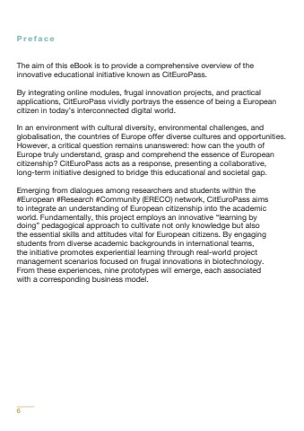 PrefaceThe aim of this eBook is to provide a comprehensive overview of theinnovative educational initiative known as CitEuroPass.By integrating online modules, frugal innovation projects, and practicalapplications, CitEuroPass vividly portrays the essence of being a Europeancitizen in today%u2019s interconnected digital world.In an environment with cultural diversity, environmental challenges, andglobalisation, the countries of Europe offer diverse cultures and opportunities.However, a critical question remains unanswered: how can the youth ofEurope truly understand, grasp and comprehend the essence of Europeancitizenship? CitEuroPass acts as a response, presenting a collaborative, long-term initiative designed to bridge this educational and societal gap.Emerging from dialogues among researchers and students within the#European #Research #Community (ERECO) network, CitEuroPass aims to integrate an understanding of European citizenship into the academicworld. Fundamentally, this project employs an innovative %u201clearning by doing%u201d pedagogical approach to cultivate not only knowledge but also the essential skills and attitudes vital for European citizens. By engagingstudents from diverse academic backgrounds in international teams, the initiative promotes experiential learning through real-world projectmanagement scenarios focused on frugal innovations in biotechnology. From these experiences, nine prototypes will emerge, each associated with a corresponding business model.6
