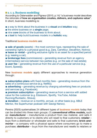 n 2. 1. 3. Business modellingAccording to Osterwalder and Pigneur (2010, p.14) %u201ca business model describesthe rationale of how an organisation creates, delivers, and captures value%u201d.In short, business modelling is:%u25aa a way to think about the business in a visual and intuitive way;%u25aa the entire business on a single page;%u25aa nine core blocks of the business to think about;%u25aa a tool to help build business models in a holistic way.Traditional business models are:%u25aa sale of goods (assets) %u2013 the most common type, representing the sale ofownership rights to a physical good (e.g. Zara, Carrefour, Decathlon, Notino);%u25aa lease or rental %u2013 granting exclusive rights to an asset for a specified period(e.g. leasing a car);%u25aa brokerage fees (commissions) %u2013 generating revenue from an agency(intermediary) service between two parties (e.g. on the sale of real estate);%u25aa user fee %u2013 generating revenue from the use of a particular service (e.g.Econt, Speedy).New business models apply different approaches to revenue generationthrough:%u25aa subscription plans with fixed monthly fees %u2013 generating revenue from thesales of a continuous service (e.g. Netflix);%u25aa advertising %u2013 generating revenue by charging advertising fees on productsand services (e.g. Facebook);%u25aa premium subscription %u2013 generating revenue from a service with addedvalue for the customer (e.g. Eduboom, Spotify, YouTube, AdidasRunning/Runtastic, Strava);%u25aa donation %u2013 revenue on a monthly, annual, or other basis (e.g. ABLEMentor, the Superhuman podcast with Georgi Nenov).Pereira (2023) systematises 24 different types of business models today thatcan be divided into three main groups: (1) conventional offline models, suchas: manufacturer %u2013 manufactures a product from raw material, and sells itdirectly to customers or to clients who will resell to final customers; retailer %u2013buys from a distributor or wholesaler and sells to final customers; brick-andmortar %u2013 a company with a physical space where consumers go to make apurchase; distributor %u2013 buys from the manufacturer and resells to retailers or602 European Entrepreneurship