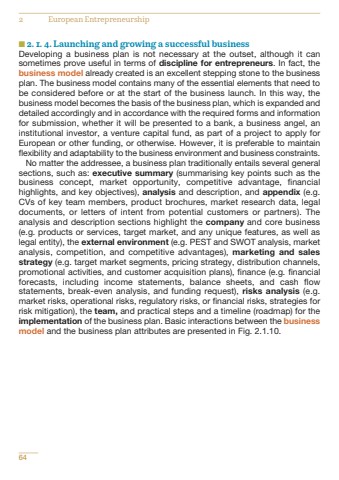 642 European Entrepreneurshipn 2. 1. 4. Launching and growing a successful businessDeveloping a business plan is not necessary at the outset, although it cansometimes prove useful in terms of discipline for entrepreneurs. In fact, thebusiness model already created is an excellent stepping stone to the businessplan. The business model contains many of the essential elements that need tobe considered before or at the start of the business launch. In this way, thebusiness model becomes the basis of the business plan, which is expanded anddetailed accordingly and in accordance with the required forms and informationfor submission, whether it will be presented to a bank, a business angel, aninstitutional investor, a venture capital fund, as part of a project to apply forEuropean or other funding, or otherwise. However, it is preferable to maintainflexibility and adaptability to the business environment and business constraints.No matter the addressee, a business plan traditionally entails several generalsections, such as: executive summary (summarising key points such as thebusiness concept, market opportunity, competitive advantage, financialhighlights, and key objectives), analysis and description, and appendix (e.g.CVs of key team members, product brochures, market research data, legaldocuments, or letters of intent from potential customers or partners). Theanalysis and description sections highlight the company and core business(e.g. products or services, target market, and any unique features, as well aslegal entity), the external environment (e.g. PEST and SWOT analysis, marketanalysis, competition, and competitive advantages), marketing and salesstrategy (e.g. target market segments, pricing strategy, distribution channels,promotional activities, and customer acquisition plans), finance (e.g. financialforecasts, including income statements, balance sheets, and cash flowstatements, break-even analysis, and funding request), risks analysis (e.g.market risks, operational risks, regulatory risks, or financial risks, strategies forrisk mitigation), the team, and practical steps and a timeline (roadmap) for theimplementation of the business plan. Basic interactions between the businessmodel and the business plan attributes are presented in Fig. 2.1.10.