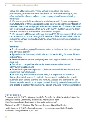 within the VR experience. These virtual instructors can guideparticipants, provide real-time feedback on form and technique, andoffer motivational cues to keep users engaged and focused duringworkouts.6. Partnership with fitness brands: collaborate with fitness equipmentmanufacturers or fitness apparel brands to provide seamless integrationbetween the virtual and physical fitness experiences. For example, userscan wear smart wearables that sync with the VR system, allowing themto track biometrics and receive data-driven insights.7. On-demand VR fitness: offer on-demand VR fitness content that userscan access from home through VR headsets. This allows individuals toexperience virtual workouts anytime, anywhere, providing convenienceand flexibility.Benefits:%u25aa A unique and engaging fitness experience that combines technologyand physical activity.%u25aa Appeals to tech-savvy individuals and those looking for novel fitnessexperiences.%u25aa Personalised workouts and progress tracking for individualised fitnessjourneys.%u25aa Social and competitive elements to enhance motivation andcommunity engagement.%u25aa Potential for partnerships and collaborations with fitness brands andequipment manufacturers.%u25aa As with any innovative business idea, it%u2019s important to conductthorough market research, validate the concept, and develop a solidbusiness plan before starting the venture. Assess the demand for VRfitness experiences in your target market, identify potential competitors,and create a strategy for marketing, operations, and revenue generation.ReferencesEndeavor Insight. (2022). Mapping the Sofia Tech Sector: A Network Analysis of theEntrepreneurship Community. Retrieved 3 March 2022, fromhttps://www.endeavor.bg/mapping-the-sofia-tech-sector/.Gladwell, M. (2011). Outliers: The Story of Success. Back Bay Books.Hadjitchoneva, J. (2018). Systemic research on entrepreneurship in Bulgaria.Economic Thought Revue, 4, 84-105.722 European Entrepreneurship