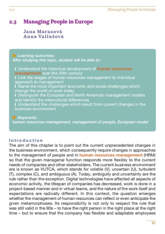 2.3 Managing People in EuropeJana Marasov%u00e1 Anna Vallu%u0161ov%u00e1 n Learning outcomes: After studying this topic, student will be able to:y Understand the historical development of human resources management over the 20th centuryy Link the stages of human resources management to individualapproach to managementy Name the most important economic and social challenges whichchange the world of work todayy Distinguish the European and North American management modelsand identify the intercultural differencesy Understand the challenges which result from current changes in thebusiness environmentn Keywords:human resources management, management of people, European modelIntroduction The aim of this chapter is to point out the current unprecedented changes inthe business environment, which consequently require changes in approachesto the management of people and in human resources management (HRM)so that the given managerial function responds more flexibly to the currentneeds of companies and other stakeholders. The current business environmentera is known as VUTCA, which stands for volatile (V), uncertain (U), turbulent(T), complex (C), and ambiguous (A). Today, ambiguity and uncertainty are therule rather than the exception. Digital technologies have affected all aspects ofeconomic activity, the lifespan of companies has decreased, work is done in aproject-based manner and in virtual teams, and the nature of the work itself andexpectations are radically different. In this context, the question emergeswhether the management of human resources can reflect or even anticipate thegiven metamorphoses. Its responsibility is not only to respect the rule thatwas still valid in the 90s %u2013 to have the right person in the right place at the righttime %u2013 but to ensure that the company has flexible and adaptable employees812.3 Managing People in Europe
