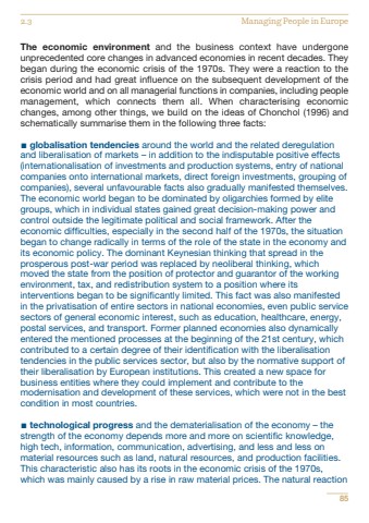 The economic environment and the business context have undergoneunprecedented core changes in advanced economies in recent decades. Theybegan during the economic crisis of the 1970s. They were a reaction to thecrisis period and had great influence on the subsequent development of theeconomic world and on all managerial functions in companies, including peoplemanagement, which connects them all. When characterising economicchanges, among other things, we build on the ideas of Chonchol (1996) andschematically summarise them in the following three facts:%u25aa globalisation tendencies around the world and the related deregulationand liberalisation of markets %u2013 in addition to the indisputable positive effects(internationalisation of investments and production systems, entry of nationalcompanies onto international markets, direct foreign investments, grouping ofcompanies), several unfavourable facts also gradually manifested themselves.The economic world began to be dominated by oligarchies formed by elitegroups, which in individual states gained great decision-making power andcontrol outside the legitimate political and social framework. After theeconomic difficulties, especially in the second half of the 1970s, the situationbegan to change radically in terms of the role of the state in the economy andits economic policy. The dominant Keynesian thinking that spread in theprosperous post-war period was replaced by neoliberal thinking, whichmoved the state from the position of protector and guarantor of the workingenvironment, tax, and redistribution system to a position where itsinterventions began to be significantly limited. This fact was also manifestedin the privatisation of entire sectors in national economies, even public servicesectors of general economic interest, such as education, healthcare, energy,postal services, and transport. Former planned economies also dynamicallyentered the mentioned processes at the beginning of the 21st century, whichcontributed to a certain degree of their identification with the liberalisationtendencies in the public services sector, but also by the normative support oftheir liberalisation by European institutions. This created a new space forbusiness entities where they could implement and contribute to themodernisation and development of these services, which were not in the bestcondition in most countries.%u25aa technological progress and the dematerialisation of the economy %u2013 thestrength of the economy depends more and more on scientific knowledge,high tech, information, communication, advertising, and less and less onmaterial resources such as land, natural resources, and production facilities.This characteristic also has its roots in the economic crisis of the 1970s,which was mainly caused by a rise in raw material prices. The natural reaction852.3 Managing People in Europe