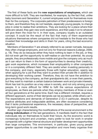 The first of these facts are the new expectations of employees, which aremore difficult to fulfil. They are manifested, for example, by the fact that, unlikebaby boomers and Generation X, current employees work for themselves morethan for the company. The corporate patriotism of their predecessors is foreignto them, and therefore they do not hesitate, especially young people, to changejobs in order to realise their ambitions. They are looking for a place where theirskills are valued, they gain new work experience, and then pass it on to whoeverwill give them the most for it. In their eyes, company loyalty is an outdatedconcept. It could be the result of the fact that many of them experiencedsituations themselves where companies did not hesitate to fire those who hadinvested their knowledge and skills in them for years, citing the bad economicsituation.Members of Generation Y are already referred to as career nomads, becausethey often change employers, and not only for financial reasons (Lelarge, 2006,p. 18). They do so because either they have nothing to learn in the job, or theydid not even get the opportunity to self-realise or use their potential. As youngpeople, they are professionally more mobile and give the company only as muchas it can return to them in the form of opportunities to develop their creativity,gain work experience, which increases their employability in other companiesor in a completely different field. They are careful when investing personally inthe company, and many, especially those with higher education, openly saywhen applying for a job that they want to protect their private life in addition todeveloping their working career. Therefore, they do not have the ambition togive everything to the company, as their grandparents did, or even their parents,but they want to maintain a certain balance between work and private interests.Work has lost its position as a key value in society, and not only among youngpeople. It is more difficult for HRM to fulfil the various expectations ofemployees, as there are periods when they employ members of three or evenall four generations at the same time. Each has a different mindset, requires adifferent approach, some of their demands can be accepted, while others can%u2019t.The expectations and demands of Generation Z (C) in particular, despite itspositive attributes and indisputable abilities, are often excessive consideringthat it lacks professional experience, the necessary dose of perspective, andlong-term good work results.Another sign characterising the modifications of the social environment is thestrong individualism of the last generations. It manifests itself in the fact thatindividuals rely on themselves to build their future. As the economic world isincreasingly turbulent and uncertain, many prefer to look for work in smallercompanies with a lighter internal structure and faster development opportunitiesthan large companies. This environment, in particular, gives young peoplegreater opportunities to use their imagination and more freely organise their892.3 Managing People in Europe