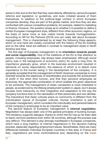 actors in this due to the fact that they were directly affected by various Europeanreforms and legislation or guidelines, and even initiated several of themthemselves. In addition to the political-legal context in which Europeancompanies develop, they are part of the global market, and thus they are alsoconfronted with various competitive problems, for example, related to marketingor finance. However, the question arises as to whether it is possible to define acertain European management style, different from other economic regions, onthe basis of some more or less visible trends towards homogenisation.According to HR for Sia Partners (2019) one can really talk about Europeanmanagement. This is characterised by at least the following three aspects,which on one hand are closely connected with the history of the EU buildingand on the other hand are defined in contrast to management styles in NorthAmerica and Asia.The first sign of European management is its orientation towards peopleand social responsibility. One of the traditions of the EU is that attention topeople, including employees, has always been emphasised. Although socialpolicy was in the background of economic policy for quite a long time, itsimportance gradually grew, which in the business environment resulted indemands on social responsibility, the essence of which is to attach moreimportance to the human being in the development of the company. It isgenerally accepted that the management of North American companies is moreoriented towards the objectives of shareholders and towards the achievementof profit in the short time horizon, and that they perceive employees asresources, the appropriate combination of which enables the given objectivesto be achieved. The management of Asian companies is more interested inpeople, as evidenced by the lifelong employment system in Japan, but it alwaysfocuses more intensively on their integration and adaptation to the way thecompany functions than on the valorisation of their personality and own abilities.The importance that Asian cultures place on community is different from theindividualism typical of European cultures. Human orientation is part ofEuropean management, which considers the individuality and personal balanceof the company%u2019s employees to be an important value.The second feature of European management is internal negotiation.Negotiation has always been one of the general principles of building Europe.This tendency supports dialogue, thanks to which the EU has so far been ableto reach common positions even within 28 countries, although the process wasvery difficult. This element is also strongly manifested in European companies,which have a long tradition of internal negotiations in the decision-makingprocess, especially regarding employment issues. Nevertheless, there are manydifferences between individual European countries in this area. In France andItaly, negotiations are more confrontational and, depending on the trade942 European Entrepreneurship