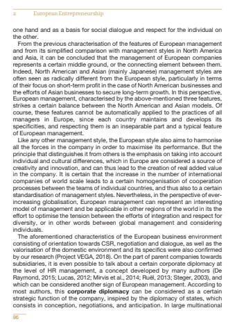 962 European Entrepreneurshipone hand and as a basis for social dialogue and respect for the individual onthe other.From the previous characterisation of the features of European managementand from its simplified comparison with management styles in North Americaand Asia, it can be concluded that the management of European companiesrepresents a certain middle ground, or the connecting element between them.Indeed, North American and Asian (mainly Japanese) management styles areoften seen as radically different from the European style, particularly in termsof their focus on short-term profit in the case of North American businesses andthe efforts of Asian businesses to secure long-term growth. In this perspective,European management, characterised by the above-mentioned three features,strikes a certain balance between the North American and Asian models. Ofcourse, these features cannot be automatically applied to the practices of allmanagers in Europe, since each country maintains and develops itsspecificities, and respecting them is an inseparable part and a typical featureof European management.Like any other management style, the European style also aims to harmoniseall the forces in the company in order to maximise its performance. But theprinciple that distinguishes it from others is the emphasis on taking into accountindividual and cultural differences, which in Europe are considered a source ofcreativity and innovation, and can thus lead to the creation of real added valuein the company. It is certain that the increase in the number of internationalcompanies of world scale leads to a certain homogenisation of cooperationprocesses between the teams of individual countries, and thus also to a certainstandardisation of management styles. Nevertheless, in the perspective of everincreasing globalisation, European management can represent an interestingmodel of management and be applicable in other regions of the world in its theeffort to optimise the tension between the efforts of integration and respect fordiversity, or in other words between global management and consideringindividuals.The aforementioned characteristics of the European business environmentconsisting of orientation towards CSR, negotiation and dialogue, as well as thevalorisation of the domestic environment and its specifics were also confirmedby our research (Project VEGA, 2018). On the part of parent companies towardssubsidiaries, it is even possible to talk about a certain corporate diplomacy atthe level of HR management, a concept developed by many authors (DeRaymond, 2015; Lucas, 2012; Mirvis et al., 2014; Ru%u00ebl, 2013; Steger, 2003), andwhich can be considered another sign of European management. According tomost authors, this corporate diplomacy can be considered as a certainstrategic function of the company, inspired by the diplomacy of states, whichconsists in conception, negotiations, and anticipation. In large multinational